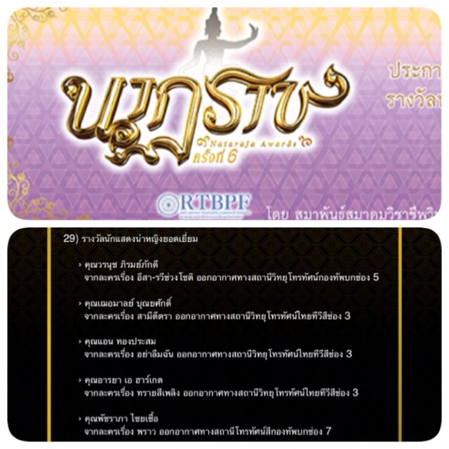 อย่างรางวัลนาฏราชครั้งที่ 2 และ 3 พลอย จาก ระบำดวงดาว ชมพู่ จาก ดอกส้มสีทอง นาฏราชครั้งที่ 4 ก็น่าจะเป็น นุ่น จาก บ่วง ไม่ก็ เจนี่ จาก แรงเงา แน่ คุณคิดว่าปีนี้จะต้องเป็นบทแรงๆไหม เช่น พลอย จาก บ่ว
