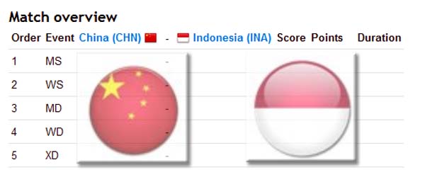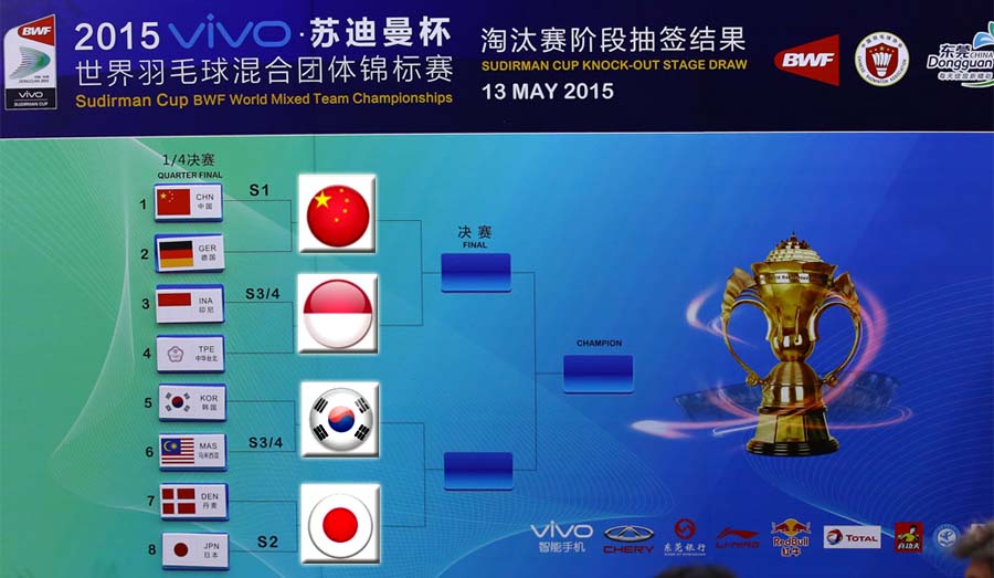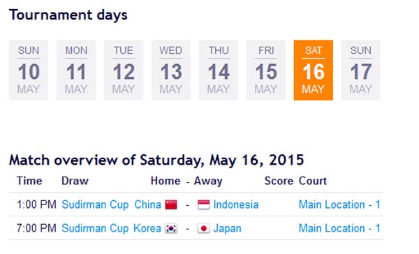 โปรแกรมการแข่งขันแบดมินตัน VIVO Sudirman Cup 2015 : รอบรองชนะเลิศ 16 พ.ค. 2558 [CHN-INA] & [KOR-JPN]