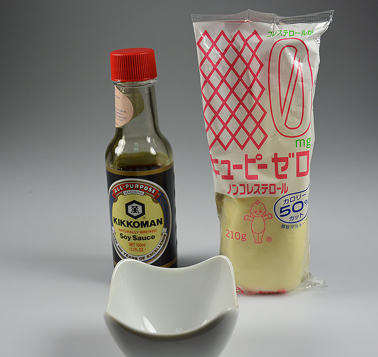 3.เทโชยุลงในถ้วยไม่ต้องมาก จากนั้นก็บีบมายองเนสลงไปในโชยุ