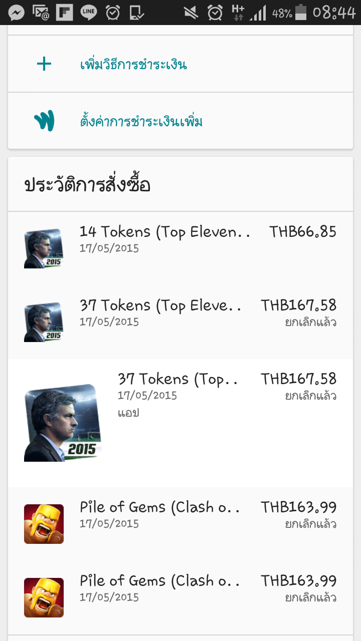 ปัญหาคือเช้ามามี sms จากธนาคารแจ้งเตือนมีการหักเงินจากบัญชี 167.58 บาท สองครั้งติดกัน ไม่ได้บอกว่าไปไหน พอโทรไปธนาคารเค้าบอกจาก google เปนชื่ออะไรสักอย่างไม่คุ้น เลยขอให้อายัดบัตรไว้ก่อน พอเข้าไปดูในอีเมลล์ มีแจ้งเตือน หมายเลขสั่งซื้อเสรจสิ้น จ่กแอพอะไรไม่รุ้ ไม่คุ้นหูเลย พอเข้าไปดูใน google play ขึ้นแบบในรูป เกมส์ top eleven ? คืออะไร ไม่เคยโหลดไม่เคยได้ยิน เลื่อนลงมา pile of gem ? ไม่เคยโหลดเลย แค่หักตังเพียบเลย ใครเคยเจอแบบนี้บ้าง แล้วสามารถร้องเรียนรึขอเงินคืนได้ที่ไหนบ้างคะ
