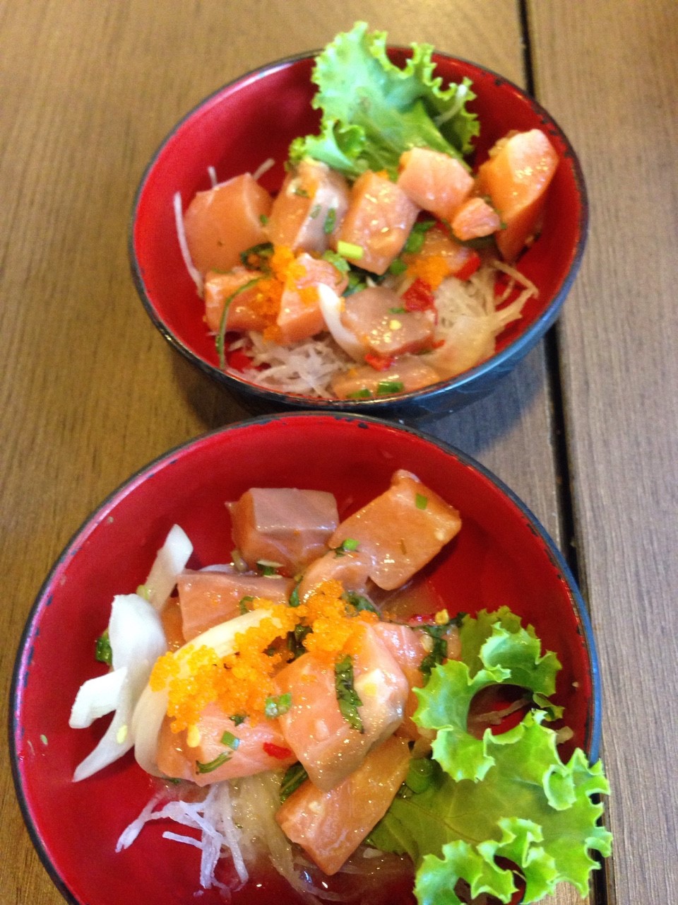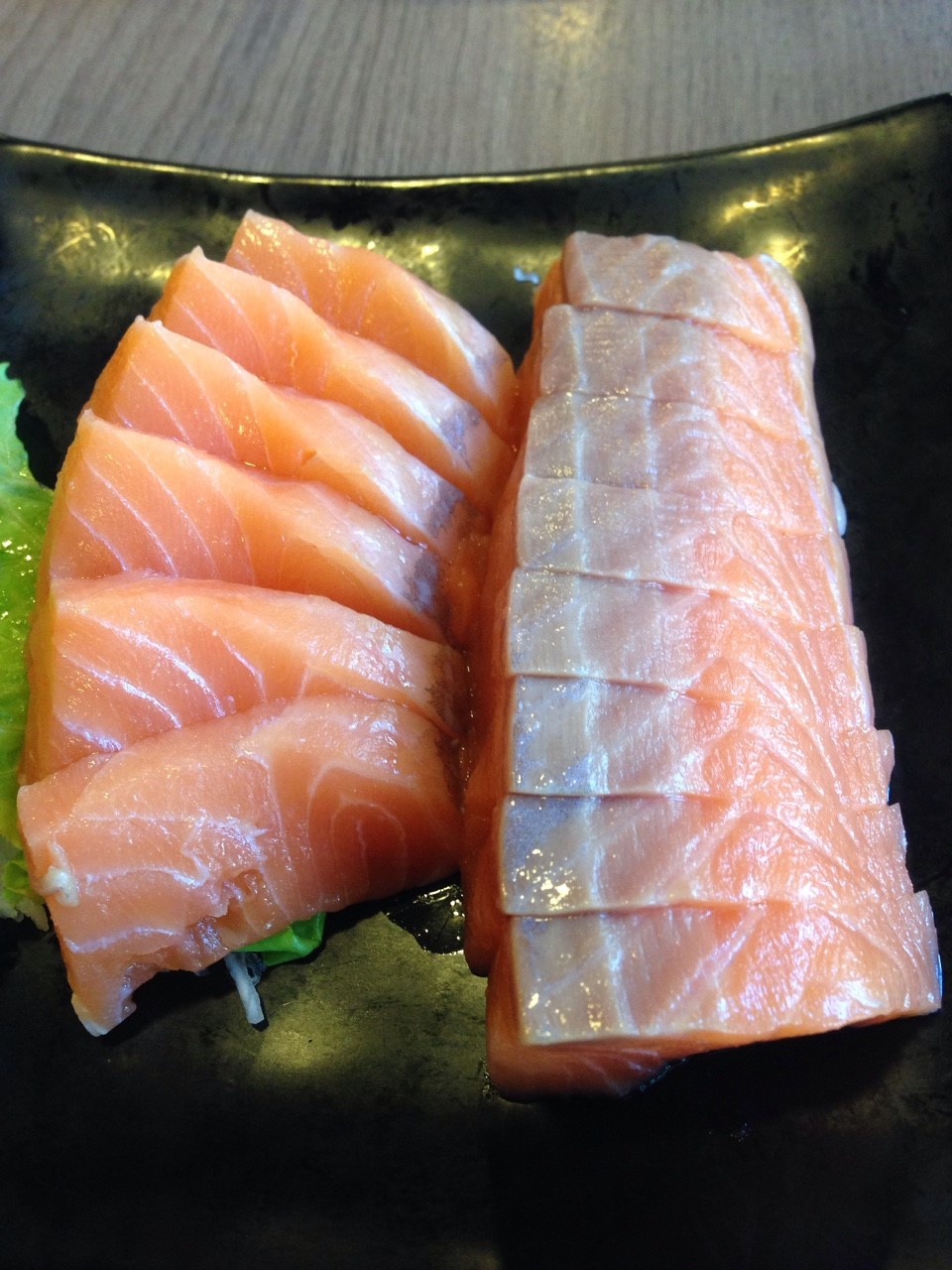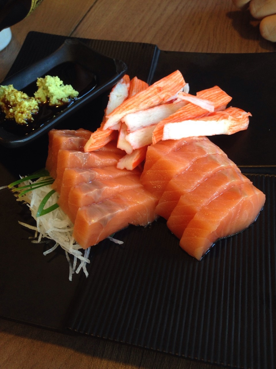 แซลมอนซาซิมิ + ปูอัด (ปลาดิบต้องเดินไปสั่งที่เค้าเตอร์)