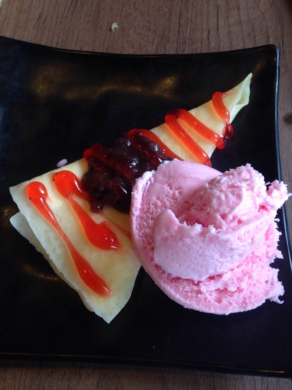 เครป + ไอติม (ในเมนูจริงๆ ไม่มีไอติมนะ ไปหยิบมาใส่เอง)