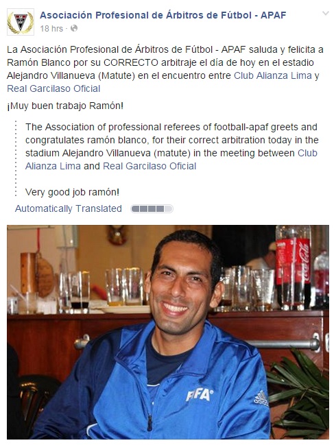 ทั้งนี้ภายหลังเกม สมาพันธ์ผู้ตัดสินฟุตบอลอาชีพของเปรูยังออกมายกย่อง เปาราม่อน ว่าทำหน้าที่ตัดสินได้อย่างยอดเยี่ยมมาก