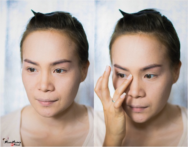 - ใช้สีอ่อนสุดในพาเลท สีขาวมุกๆ ทาช่วงรอยพับ และหัวตาค่ะ