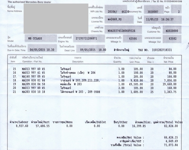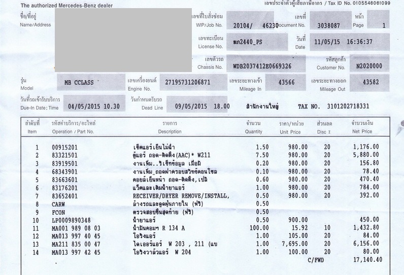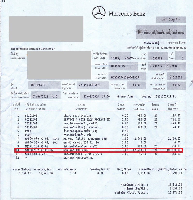 เอารถกลับมาใช้ได้ปกติดี แต่มีปัญหาเรื่องอื่นคือแอร์ไม่ค่อยเย็น เลยเอาเข้าศูนย์เดิมอีกวันที่ 4 พค ต้องเปลี่ยนคอยล์เย็นเสียค่าซ่อมไปอีก 71,xxx ไปรับรถวันที่ 11 พค พนักงานแจ้งว่าแบตฯเริ่มมีปัญหาแล้วนะ ผมก็บอกไปว่าแบตฯเพิ่งเปลี่ยนไป 2 สัปดาห์ก่อน พนักงานก็หันไปกดดูเรคคอร์ดเก่าในคอมฯ แล้วก็บอกว่าจริงด้วยเพิ่งเปลี่ยนไป สงสัยเค้าจำผิดสลับกับรถอีกคันที่เลขทะเบียน 2440 เหมือนกัน แต่คนละหมวดอักษร ผมก็สงสัยในใจว่ามันจะบังเอิญไปไหมนะที่รถเลขทะเบียนเหมือนกันแต่หมวดอักษรต่างกันจะเป็น MB เหมือนกัน แล้วเอามาซ่อมศูนย์เดียวกัน ในเวลาเดียวกันอีก
