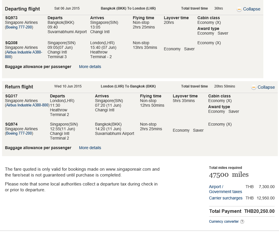 ถ้าบินออกจาก BKK ระบบจะคำนวณไมล์เป็น 2 ส่วนครับ เช่นตัวอย่าง กรุงเทพฯ-ลอนดอน-กรุงเทพฯ คือ 1. BKK-SIN-BKK = 12,500 ไมล์ 2. SIN-LHR-SIN 35,000 ไมล์ รวมใช้ไมล์ทั้งสิ้น 47,500 ไมล์