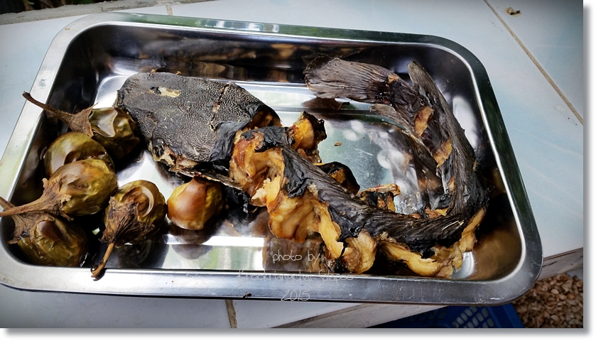 ทิ้งไว้เย็นแกะเอาแต่เนื้อ มะเขือก็ลอกเปลือกทิ้งไป