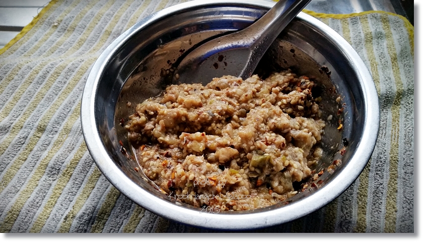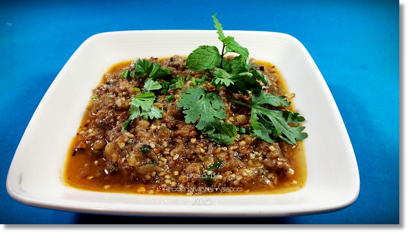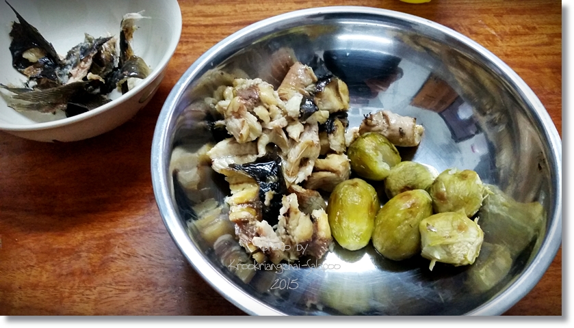 เอาปลาที่สับรวมกับมะเขือออกมา ใส่พริกลาบเมือง ผักไผ่ (ผักแพว) สะระแหน่ ทั้งหมดคลุกให้เข้ากัน