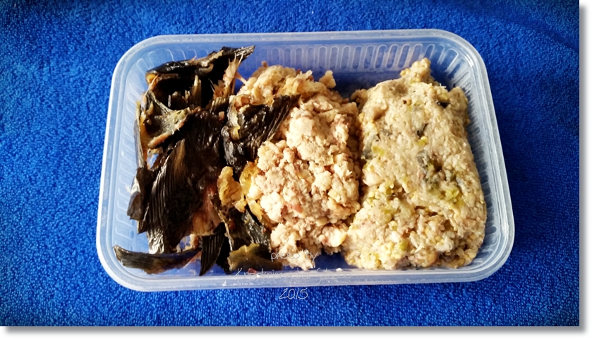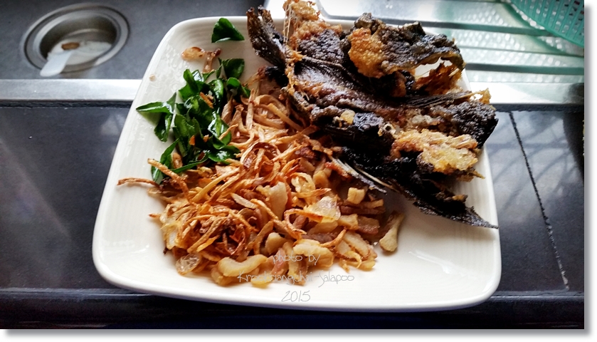 เตรียมเครื่องกรอบหรือที่บางคนเรียกว่า "หมี่" ประกอบด้วย หอมแดงซอย ขิงแก่ซอยฝอย ใบมะกรูด หนังปลา มันแข็ง