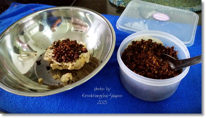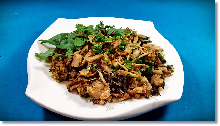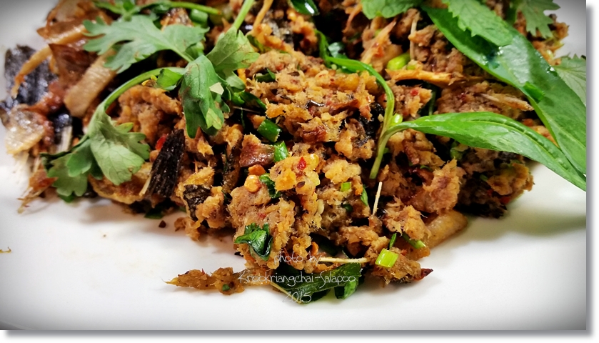 อีกหนึ่งลาบคือลาบหมี่ ทำต่อไปเลย นำเนื้อปลาที่สับแล้ว ตักพริกลาบใส่ลงไป (ดูเหมือนน้อยนะ แต่ถ้าไปรวมกับเครื่องกรอบ