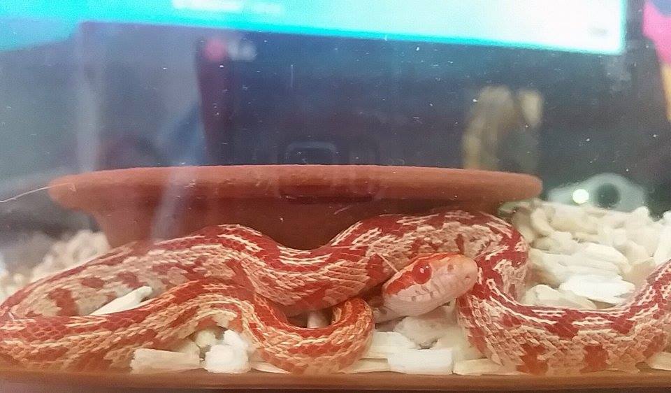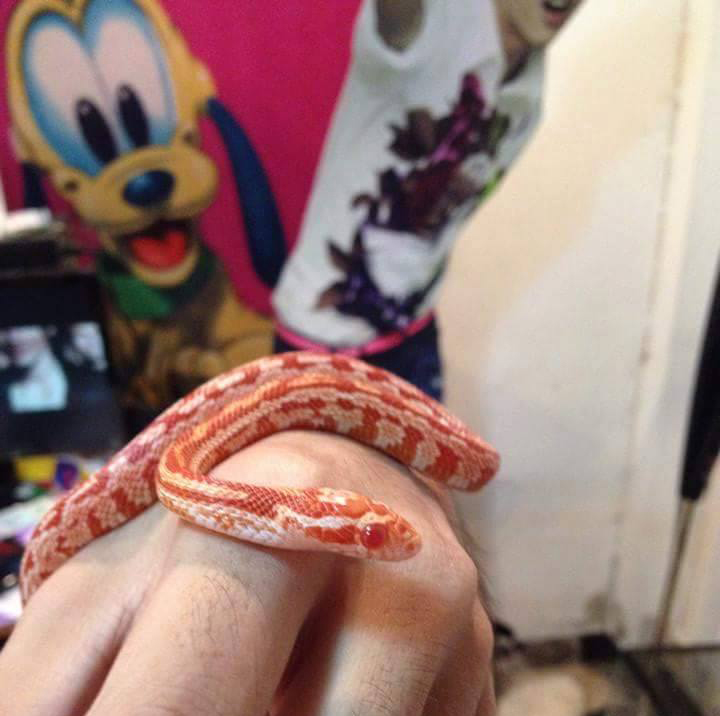 ตัวนี้เป็นงู Corn Snake นะครับ อายุก็ยังไม่เท่าไหร่ครับ ยังเป็นเด็กใส ๆ อยู่ 10 เดือน - 1 ขวบ ได้ครับ