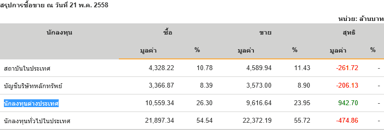 Sinthorn Summary 21/5/2558 : ต่างชาติซื้อสุทธิ 942.70 ลบ.