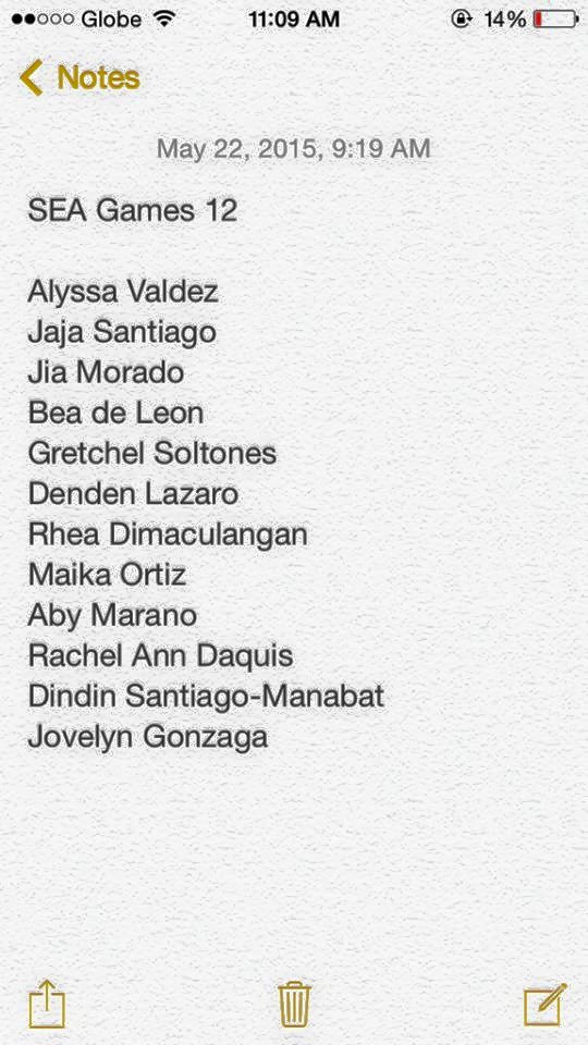 รายชื่อผู้เล่นฟิลิปปินส์ในรายการซีเกมส์ที่สิงคโปร์ ซึ่งปินส์หมายมั่นจะคว้าเหรียญสักเหรียญในรายการนี้ เพื่อให้วอลเลย์บอลในประเทศตัวเองบูมขึ้นมาให้เทียบเคียงกับบาสเก็ตบอล ชุดนี้ปินส์ก็โม้อีกตามเคยว่า เป็นผู้เล่นที่ดีที่สุดของเขา เป็นชุดเด็กรุ่นใหม่ที่จะปั้นเป็นทีมชาติของเขาต่อไปในอนาคต