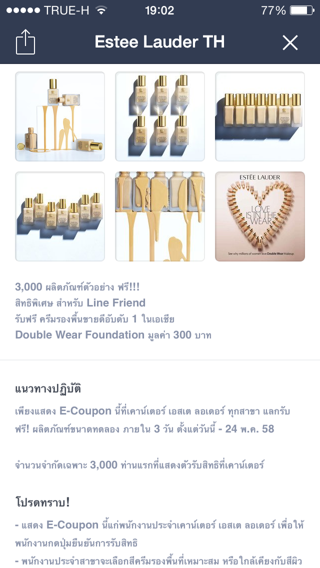 สำหรับใครที่เล่นแชท โปรแกรม Line อย่าพลาดนะคะ เอสเต้เขาแจกรองพื้น ดับเบิ้ลแวร์ ขนาดทดลอง เฉพาะ วันนี้ - 24 พ.ค.58 เท่านั้นนะคะ