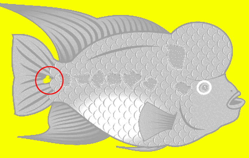 ปลาหมอสีที่เลี้ยงไว้หางเปื่อยเป็นรูแถวโคนหางครับ