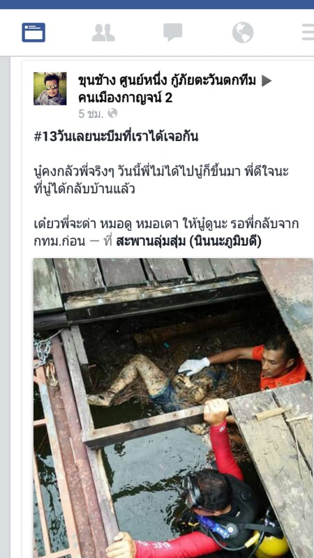 แต่มีอยู่เคสหนึ่งเด็กจมน้ำ เสียชีวิต13 วัน ถึงเจอ ผมเฝ้าดูทางเฟส เห็นทีมกู้ภัยทำงานทุกวันตลอดเวลา ไปทุกวัน แค่อยากจะบอกว่าพวกท่านสุดยอดจริงๆเลยครับ พวกท่านเป็นคนที่ดีมาก