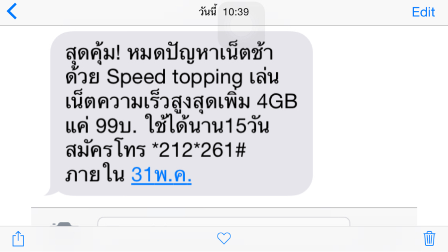 เนื่องจากอินเตอร์เน็ตแพ็กหลักที่เราสมัครไว้ได้ใช้หมดก่อนจะครบรอบบิล เราจึงจำเป็นต้องสมัครแพ็กเสริม เราได้รับSMSจากDtacแบบนี้ เราเลยกด*500*93#แล้วโทรออก ระบบตอบรับอัตโนมัติแจ้งว่า ต้องรอSMSยืนยันถึงก่อ