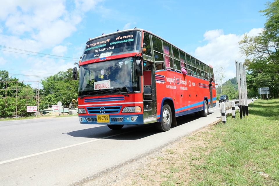 รถตู้จากกรุงเทพถึงสถานีขนส่งกาญจนบุรี ใช้เวลาเดินทางประมาณ 2 ชั่วโมงครึ่ง ไปถึงพอมีเวลาทานข้าวเที่ยง เก็บพลังเดินทางต่อไป ที่พักของเราอยู่บ้านแก่งจอ ต้องต่อรถไปสายกาญ-สังขละบุรีค่ะ มีทั้งรถตู้แบบติดแอร์และรถเมล์แบบแอร์ธรรมชาติ ตอนนั้นไม่ทันได้เลือกว่าจะไปแบบไหน พี่คนขับรถเมล์ใกล้ๆตะโกนเรียกบอกว่าน้องๆรถจะออกแล้วนะ เท่านั้นแหละวิ่งเลยค้าบ