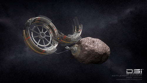 ภาพจำลองจากศิลปิน กับโครงการที่อยู่อาศัยนอกโลก พร้อมๆ กับการทำเหมืองขุดหาแร่จากดาวเคราะห์น้อย (Deep Space Industries)
