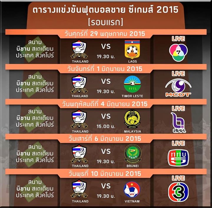โปรแกรมถ่ายทอดสดฟุตบอลชาย ซีเกมส์ 2015 รอบแรก วันศุกร์ที่ 29 พฤษภาคม ไทย พบ ลาว ช่อง 7 ถ่ายทอดสด เวลา 19.30 น. วันจันทร์ที่ 1 มิถุนายน ไทย พบ ติมอร์ เลสเต้ ช่อง 9 ถ่ายทอดสด เวลา 19.30 น. วันพฤหัสบด