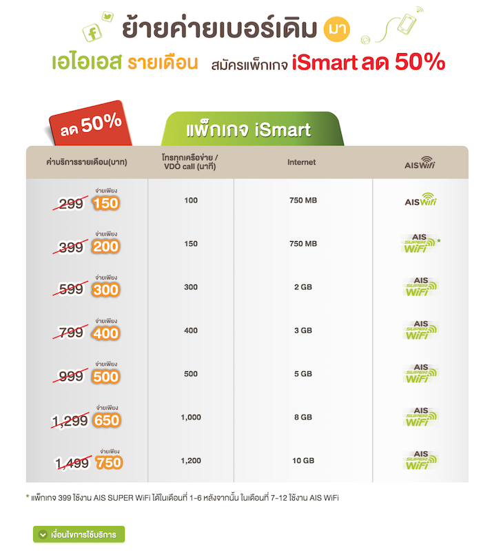 ตอนนี้ดูแพ็คเกจในนี้ http://www.ais.co.th/move-to-ais/postpaid/