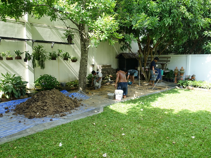 ช่างกำลังขุดดินอยู่ใต้ต้นไม้หลังบ้าน ทำไรกัน