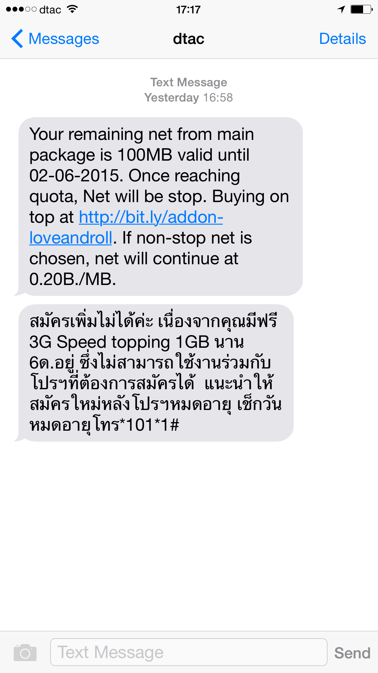 ตอนนี้คือไม่มีเน็ตใช้ งงว่าทำไมต้องยกเลิกให้เสียสิทธิ์ด้วยครับ ดีแทค ผมจะซื้อคุณก็ไม่ขาย ต้องไปซื้อซิมเจ้าอื่นมาใช้เหรอครับ ตอนซิกเว่ไม่อยู่ สัญญาณก็ห่วยมาก ตอนนี้ซิกเว่กลับมา อะไรๆก็ดีขึ้น แต่ระบบ Love&Roll ที่ไม่มี FUP แถมซื้อเพิ่มไม่ได้นี่ คงไม่สามารถบอกได้ว่าดี น่าจะเป็น "Love and เลว" มากกว่านะครับ