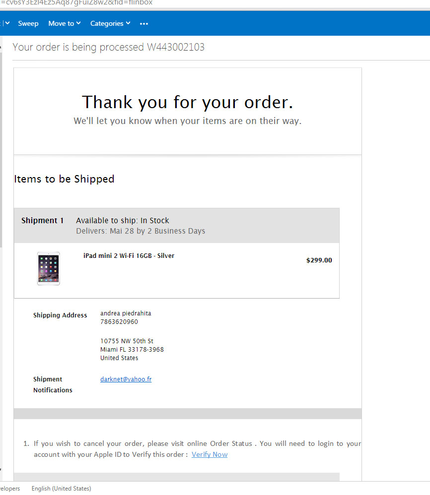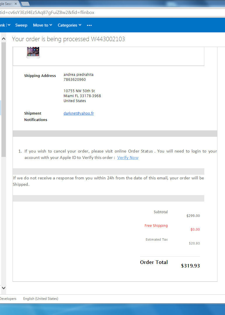 เมื่อเช้าระหว่างขับรถส่งลุกไปโรงเรียน ก็ได้รับเมลล์ว่าสั่งซื้อไอแพดมินิจาก apple store แต่ไม่ได้ซื้อ เป็นเมลล์ของปลอม หลอกลวงให้เราเข้าไปหรือเปล่าคะ