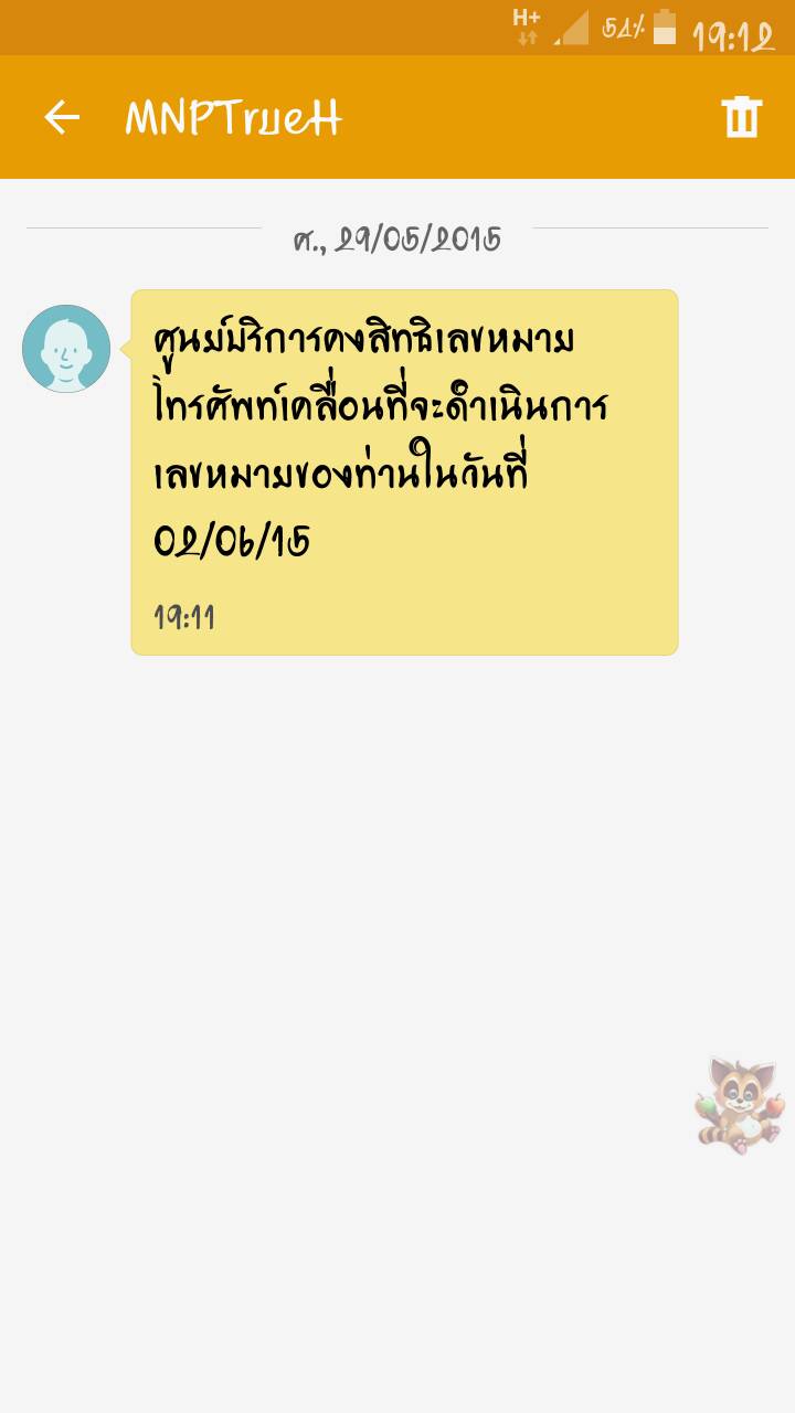 เมื่อให้ CallCenter True-H ดำเนินการให้ไม่ได้ผล เมื่อวานตอนเช้าเลยไปให้ศูนย์ TRUE คีย์ย้ายค่ายให้ใหม่ และวันนี้ เวลา 19.11 น. ได้รับ SMS ตามภาพ รวดเร็วทันใจ แปลว่าย้ายค่ายสำเร็จแล้ว ถูกต้องมั๊ยครับ