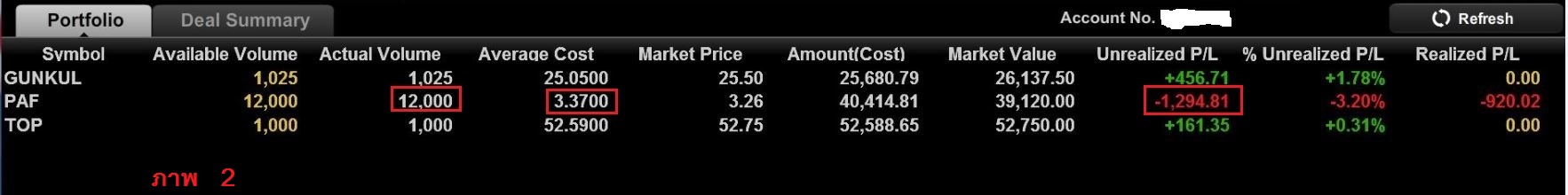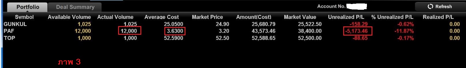3.วันรุ่งขึ้นค่า AveragCost เปลี่ยนไปเป็น 3.63 ทำให้ผมขาดทุนเพิ่มขึ้น (ภาพ 3)