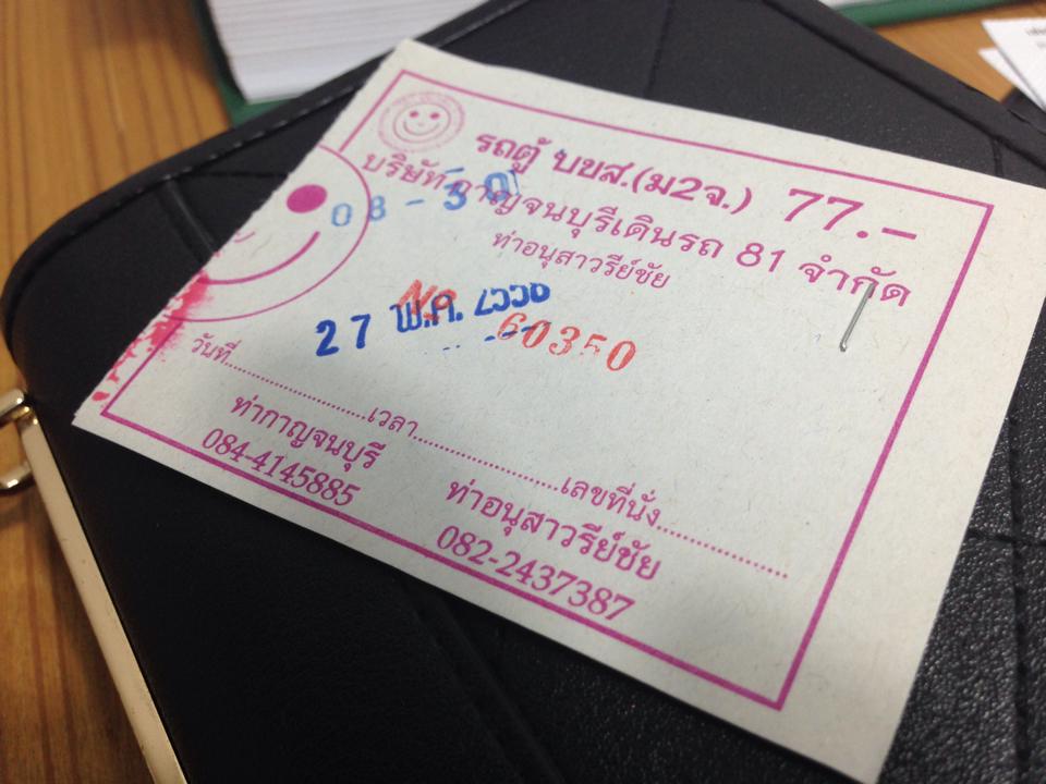 จริงๆรถที่วิ่งไปสังขละบุรีนอกจากรถตู้ ก็จะมีรถบัสแดงด้วยนะคะ หน้ารถเขียนว่า กาญจนบุรี - สังขละบุรี แต่พวกเราต้องการประหยัดเวลาเดินทาง จึงตัดสินใจนั่งรถตู้กันไปเลย เป็นรถตู้ที่หน้าออฟฟิศเขียนว่า เอเชียไทรโยคเดินรถ ค่ารถตู้ 175บาท
