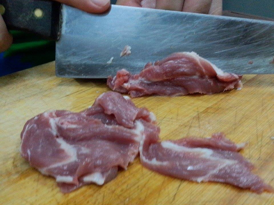 2.หั่นหมูให้ได้แบบนี้นะจ๊ะสไลด์บางๆเวลาเราหมักมันจะได้นุ่มชุ่มลิ้นจนปลิ้นตีลังกา