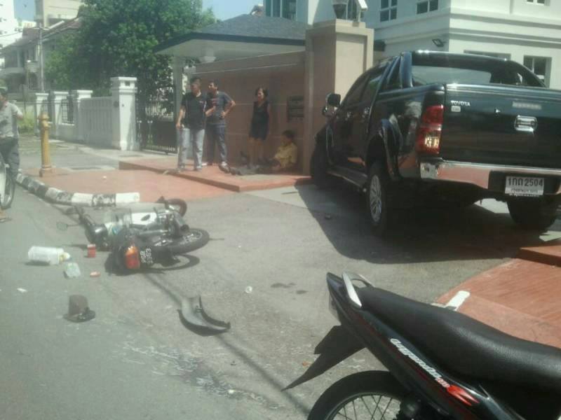 มีรถมอไซ มาชนกับรถกระบะของบริษัทเรา ในเวลางาน ชนกันทางแยก เรามาทางเอก ส่วนเขาออกมาจากในซอย ชนเข้าทางด้านซ้าย ล้อหน้า เราไม่เป็นอะไร แต่คนขับมอไซต์บาดเจ็บสาหัส ตอนนี้ยังไม่ฟื้น มีแผลถลอก หม