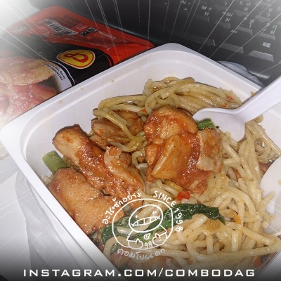 วัตถุดิบ : สปาเก๊ตตี้ผัดขี้เมา / ไก่ซอสบาร์บีคิว