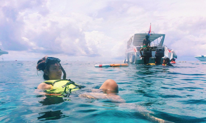 11 โมง เรานั่งเรือมาอีกจุดของเกาะเพื่อดำน้ำ ดูปะการัง