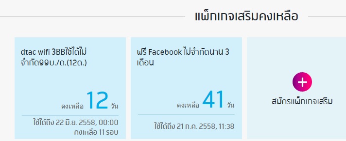 จากแพ็คเกจเสริมคุณมี SOCIAL usage คงเหลือ 1.47 MBใช้งานได้จนถึงวันที่ 17/03/2017 จาก Save Safe 512 199Baht 30 Daysคุณมี 3G/EDGE/GPRS คงเหลือไม่จำกัดจำนวนใช้งานได้จนถึงวันที่ 23/03/2017 จาก Free WiF
