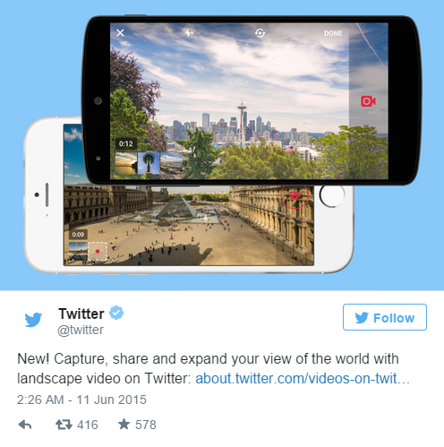 ในที่สุดก็มีข่าวดีสำหรับสาวกทวิตเตอร์ที่รักการถ่ายและอัพโหลดวีดีโอเป็นชีวิตจิตใจ เมื่อวันนี้ ทวิตเตอร์ ไมโครบล็อกกิ้งชื่อดัง ได้มีประกาศอนุญาตให้ผู้ใช้สามารถที่จะถ่ายและแชร์วีดีโอแบบ Landscape ได้แล้ว จากที่ก่อนหน้านี้ การถ่ายวีดีโอผ่านทางทวิตเตอร์จะถูกจำกัดพื้นที่ให้เป็นกรอบสี่เหลี่ยมเท่านั้น