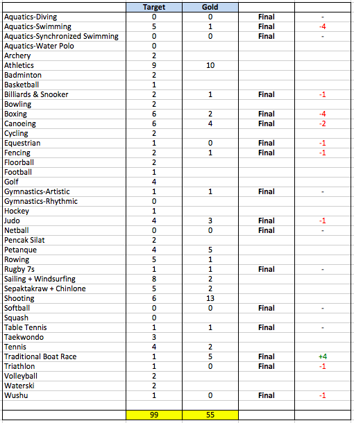 เริ่มจาก "กรีฑา" นักกีฬาประเภทลู่ทำผลงานได้ดีเป็นที่น่าพอใจ วิ่งข้ามรั้วชาย-หญิง และทีมผลัดชาย 4x400 ได้เหรียญทอง ส่วนทีมหญิงได้เหรียญเงิน ส่วนนักกีฬาประเภทลานก็เป็นไปตามมาตรฐาน เก็บได้เพิ่มอีก 2 เหรียญทองจากพุ่งแหลนชายและค้ำถ่อหญิง ตอนนี้รวมทั้งหมดทำไปแล้ว 10 เหรียญทอง ถือว่าเกินเป้าที่ตั้งไว้ (แต่โดยส่วนตัวคิดว่าเป้าจริง ๆ ของสมาคมควรจะต้องอยู่ที่ 12-15 เหรียญทอง หรือให้เท่ากับคราวที่แล้ว) อย่างไรก็ตาม พรุ่งนี้วัดกันวันสุดท้าย คิดว่าไทยได้ลุ้นเพิ่มอีกหลายเหรียญแน่นอน ทั้งจากทีมผลัด 4x100, สตกรีฑา, และประเภทลานอื่น ๆ