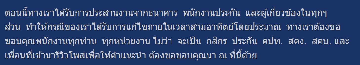 ตอนนี้ทางเราได้รับการประสานงานจากธนาคาร พนักงานประกัน และผู้เกี่ยวข้องในทุกๆส่วน ทำให้กรณีของเราได้รับการแก้ไขภายในเวลาสามอาทิตย์โดยประมาณ ทางเราต้องขอขอบคุณพนักงานทุกท่าน ทุกหน่วยงาน ไม่ว่า จะเป็น กสิกร ประกัน คปท. สคง. สคบ. และเพื่อนที่เข้ามารีวิวโพสเพื่อให้คำแนะนำ ต้องขอขอบคุณมา ณ ที่นี้ด้วย
