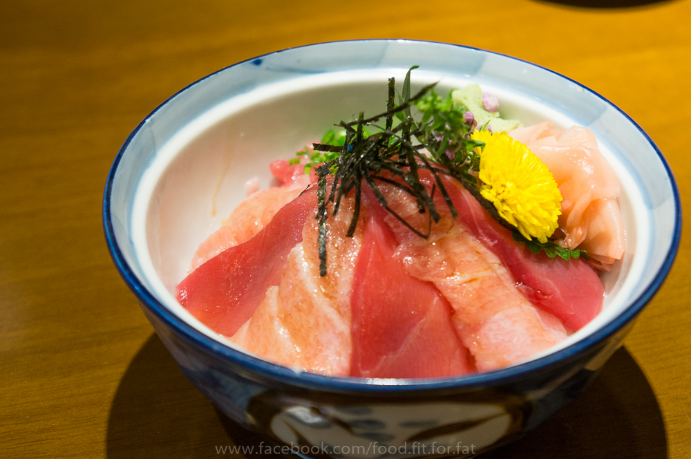 เนื่องจากหิวทูน่ามาก จึงต้องเลือกระหว่างสั่งพี่น้อง hon maguro แบบ nigiri สามคำ ราคา 990 บาท กับ don ชามนี้ ซึ่งมีทูน่าสามแบบ คือ akami, otoro, negi toro (อยุ่อีกฝั่งนึงของภาพ) ราคา 1200 บาท ก็เลยเลือก don เพื่อความอิ่มท้องครับบ
