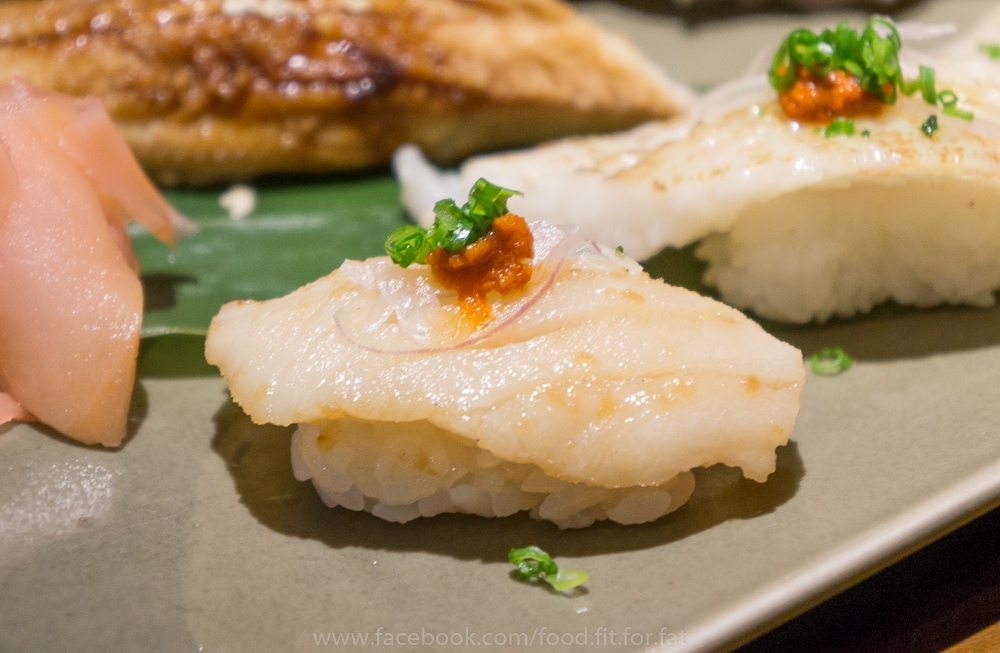 ตัว nigiri นั้นปั้นขนาด "พอดีคำ" คงไม่ได้ edomae เป๊ะๆ ก็ตามรูปเลยครับ ปลาใหญ่กว่าข้าวนิดหน่อย วาซาบิไม่ได้ใส่มาให้ การปั้นอยู่ในเกณฑ์ดี ลงน้ำหนักดี cutting ปลาใช้ได้