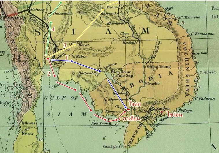 หมายเลข 2 กองทัพเรือของเจ้าพระยาพระคลัง(ดิศ บุนนาค) ยกพลเรียบอ่าวไปตีเมืองฮาเตียนหรือพุทไธมาศ เกณฑ์ทหารจากกรุงเทพฯและหัวเมืองริมน้ำ ๑๕,๐๐๐ คน เกณฑ์ทหารจากเมืองจันทบุรี ตราด และเขมรอีก ๕,๐๐๐ คน รวมเป็นพลประมาณ ๒๐,๐๐๐ คน