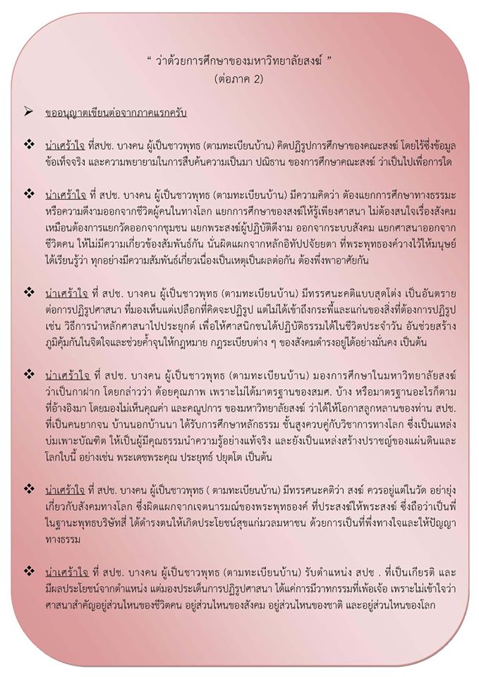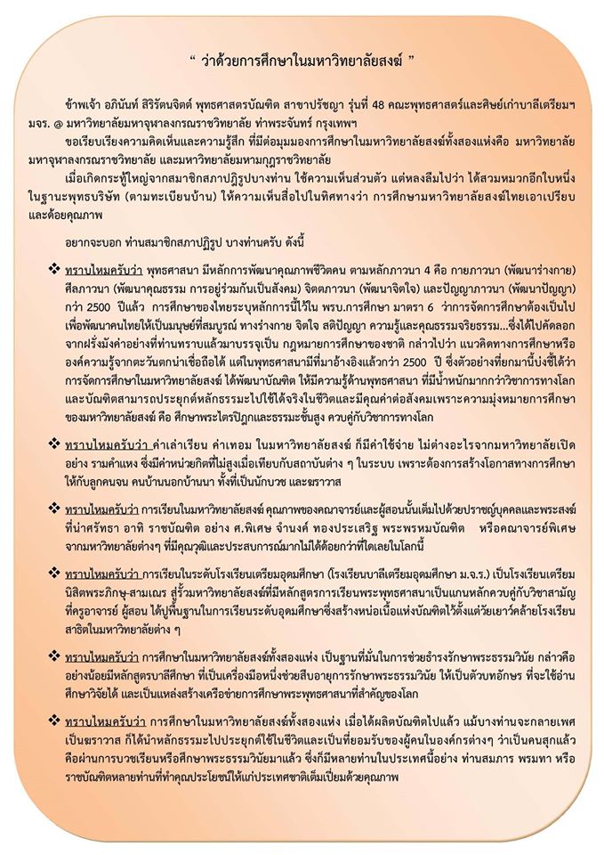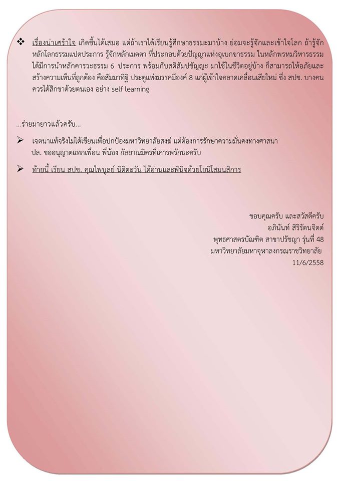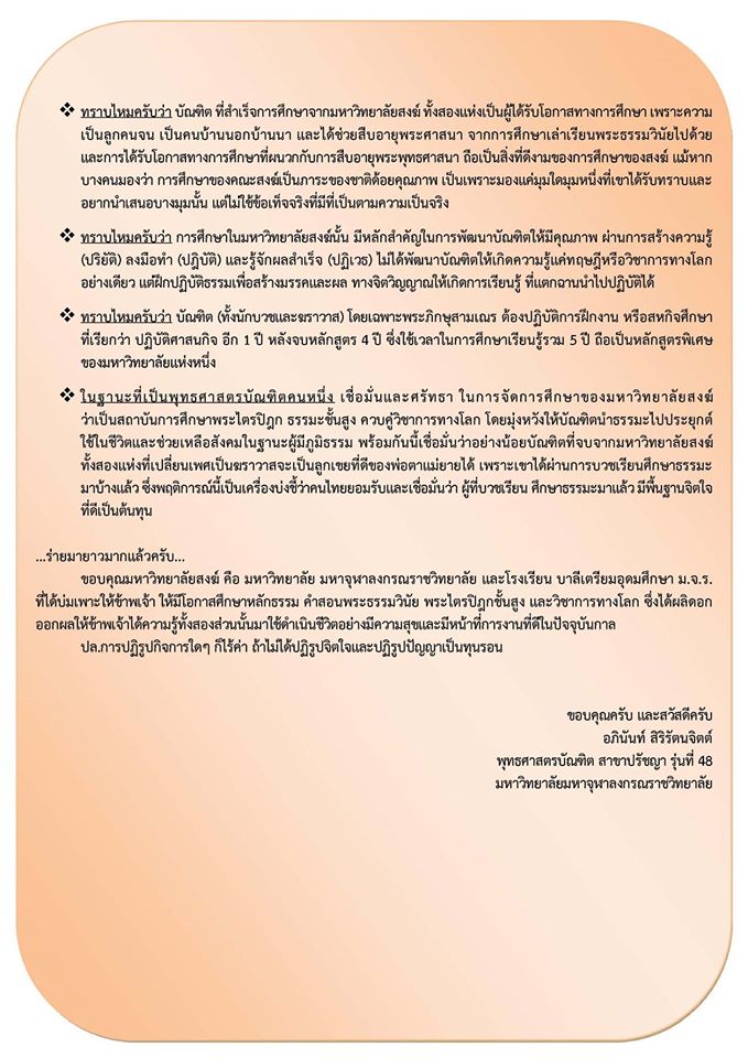 อันนี้เป็นความเห็นของเพื่อนผมคนหนึ่งครับ ผมกับเพื่อนในกลุ่มซึ่งเรียนมาด้วยกันได้คุยกันแล้วและตัวผมเองก็คุยกับรุ่นน้องๆ ซึ่งก็บวชเรียนด้วยกันมา ผมก็อยากรู้เหมือนกันว่า ณ ตอนนี้จะอะไรนักหนากับการเรียนของโรงเรียนพระปริยัติและการเรียนนักธรรมและบาลี แทนที่จะเห็นดีงามกับการให้โอกาสทางการศึกษากับอีกทางเลือกหนึ่ง แต่จะมาปิดกั้นว่าต้องแบบนั้นแบบนี้เพียงเพราะท่านคิดว่าเสียงดังกว่าคนอื่น มีความสามารถผลักดันได้ แทนที่จะใช้โอกาสนี้ส่งเสริมพัฒนาให้ขยายกว้างขึ้นกว่าที่เป็นอยู่กลับกลายจะมาปิดกั้น สำหรับผมแล้วเป็นความคิดที่คับแคบมากครับ
