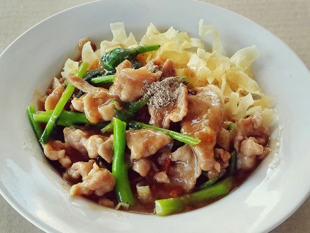 . . . เส้นใหญ่กรอบราดหน้าหมูหมัก . . .