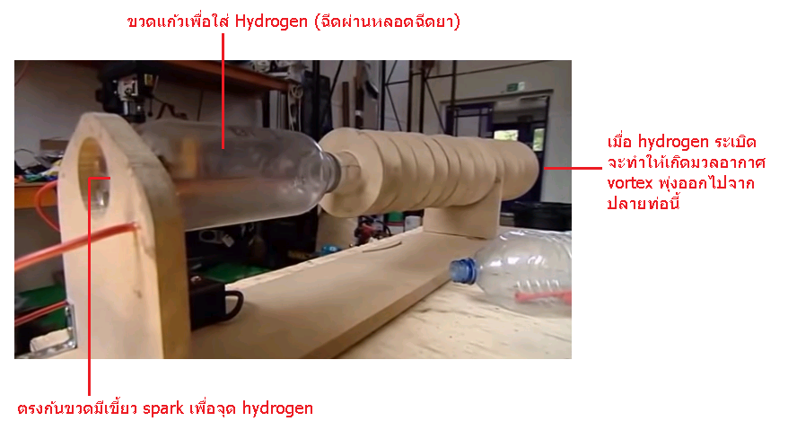 เมื่อ hydrogen ถูกไฟ spark ก็จะระเบิดทำให้เกิดแรงอัดสูงในขวดเหล็ก