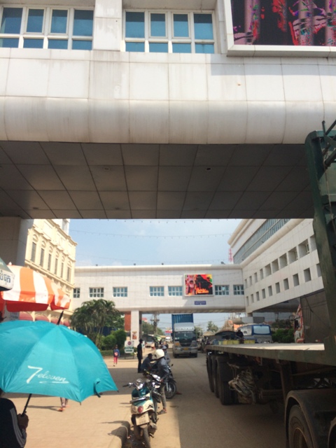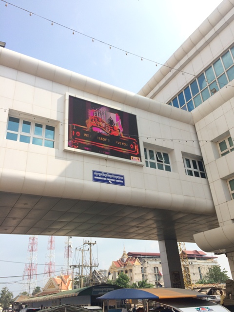 เดินไปจนถึงสะพานเชื่อตึกที่สอง จะเห็นจอทีวีใหญ่ๆ ให้ข้ามถนนไป แล้วไปทำการตรวจคนเข้าเมืองฝั่งเขมรครับ
