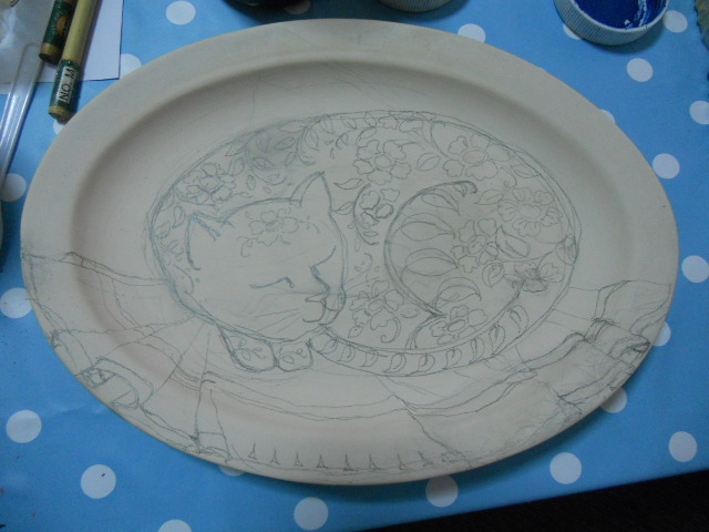 วันนี้ลงภาพวาดแมวบนจานเซรามิก แบบที่เผาครั้งแรกไว้แล้ว เรียกว่าระบายสีใต้เคลือบ