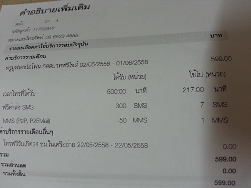 ใช้แพคเกตแบบ 599.- ตอนซื้อเครื่องมีโปรฯ ครึ่งราคา 12 รอบบิล ก็ประมาณ 300 กว่าบาท ใช้ไปแล้ว8บิล. แต่ตอนนี้เช็คใน true iservice มันขึ้น 600 กว่าบาท มันเกินมาได้ไงอ่า? ค่าโทร 300 นาทีก็ยังใช้ไม่ครบ แต่