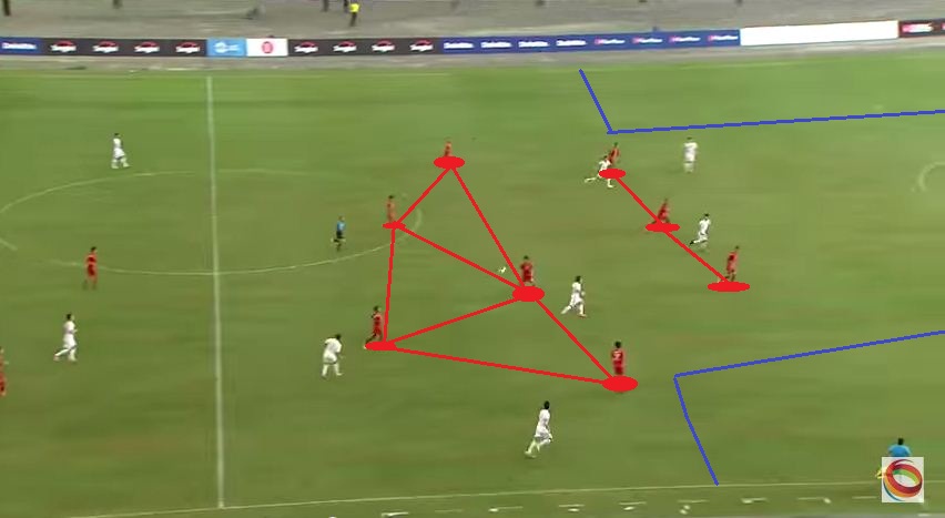 พม่า คล้ายกับว่า เค้าพยายามเล่นเช็คล้ำหน้ารึเปล่าครับ กองหลังดันสูงมากเลย ฟรีโซน(สีน้ำเงิน)ด้านข้างเยอะ แต่ไม่ค่อยมีช่อง (หรือปีกของเค้าเร็วรึเปล่าครับ? 55) อย่างน้อยระวังไว้ก็ดี 55