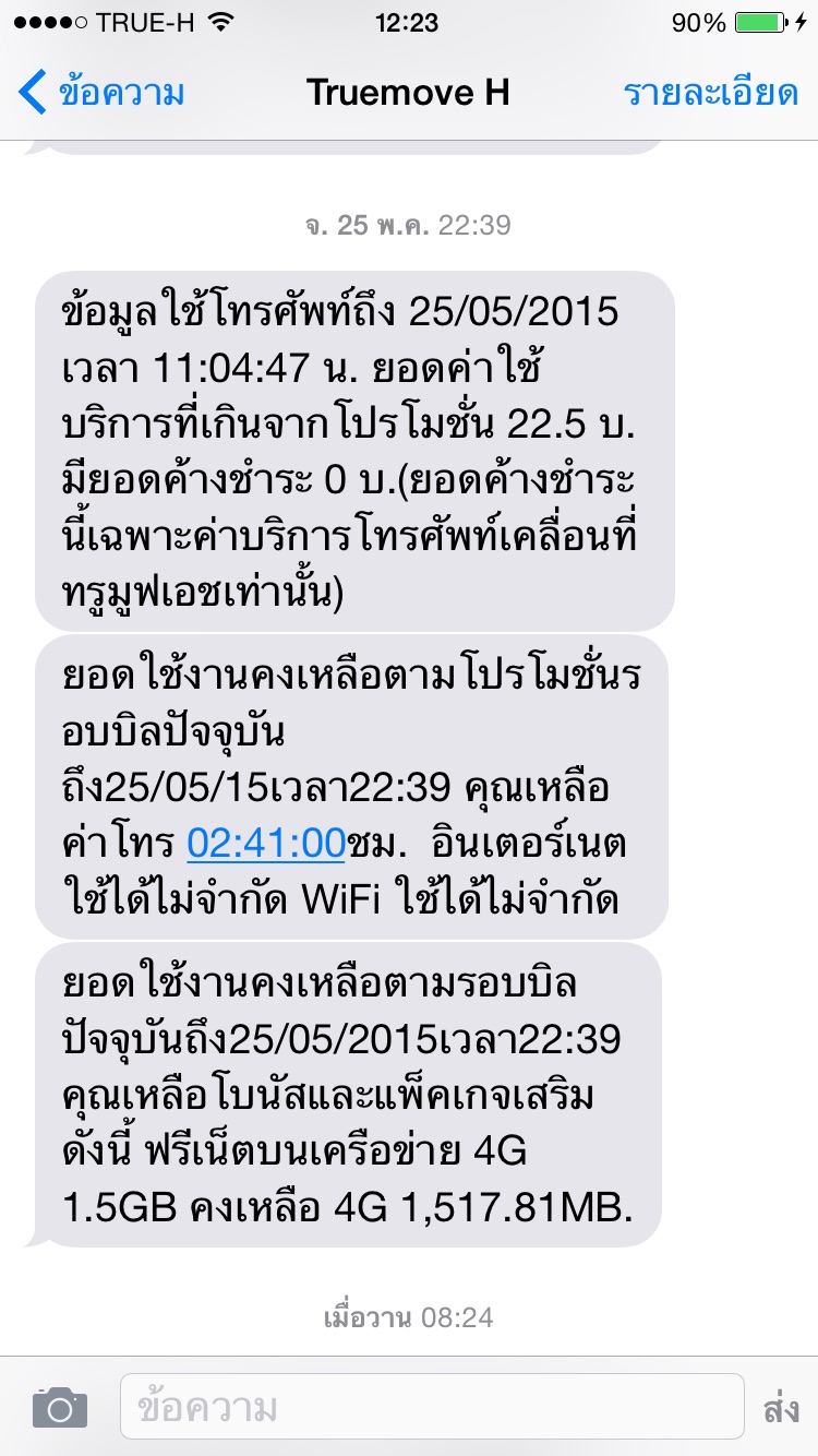 เพราะเวลาจะใช้อะไรเราจะคอยเช็คโปรที่เหลือตลอด โดยกด*939*1# และจากในเม็จเส็จจะเห็นว่า ในวันเดียวกันคือ 25/5/58 เรามีแจ้งว่ามีค่าส่วนเกิน22.50บาทแต่ตอนนั้นไม่ได้ใส่ใจรายละเอียด และอีกทีเวลา4ทุ่มกว่าๆซึ่งเราจะใช้โทรศัพท์ก็มีแจ้งมาว่าเรายังเหลือค่าโทรอีก2ชั่วโมงกว่าที่ยังสามารถใช้ได้จากโปรโมชั่นเหมาของเรา